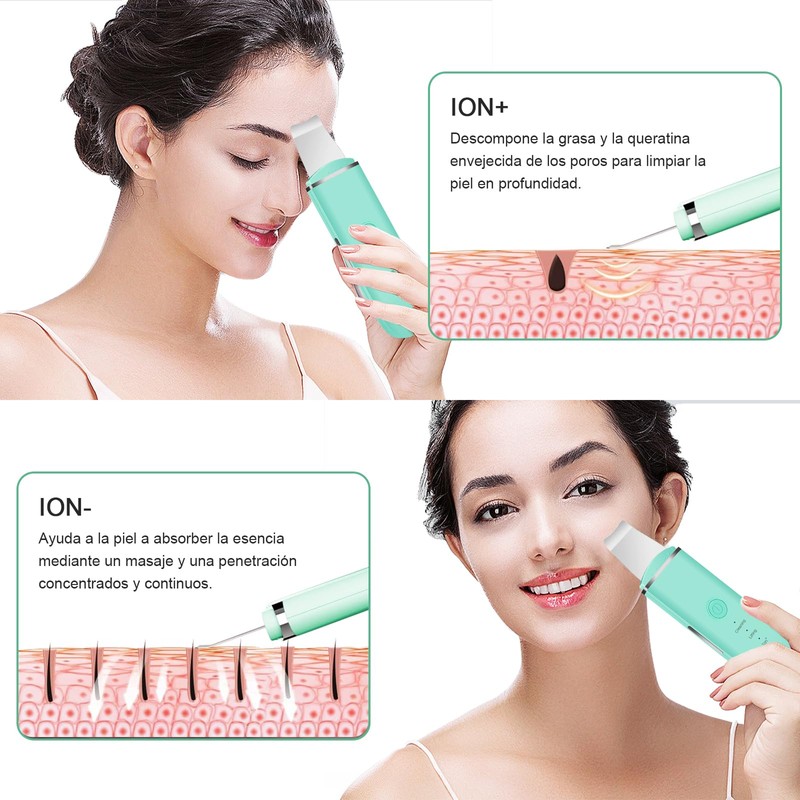 - 【UTILIZANDO 4 MODOS DE ESPÁTULA FACIAL PARA LA PIEL】 1-LIMPIEZA: trabaja con un limpiador facial diario, limpia profundamente tu rostro. 2-LIFTING: micro-voltaje EMS, estimula la regeneración de colágenos y para tensar la piel. 3-LON +: ayuda a eliminar puntos negros rebeldes, aceite de piel muerta y polvo de maquillaje, etc. 4 LON-: ayuda a la piel a absorber rápidamente la nutrición de los productos para el cuidado de la piel . (Cuando presione la quinta vez, se detendrá)