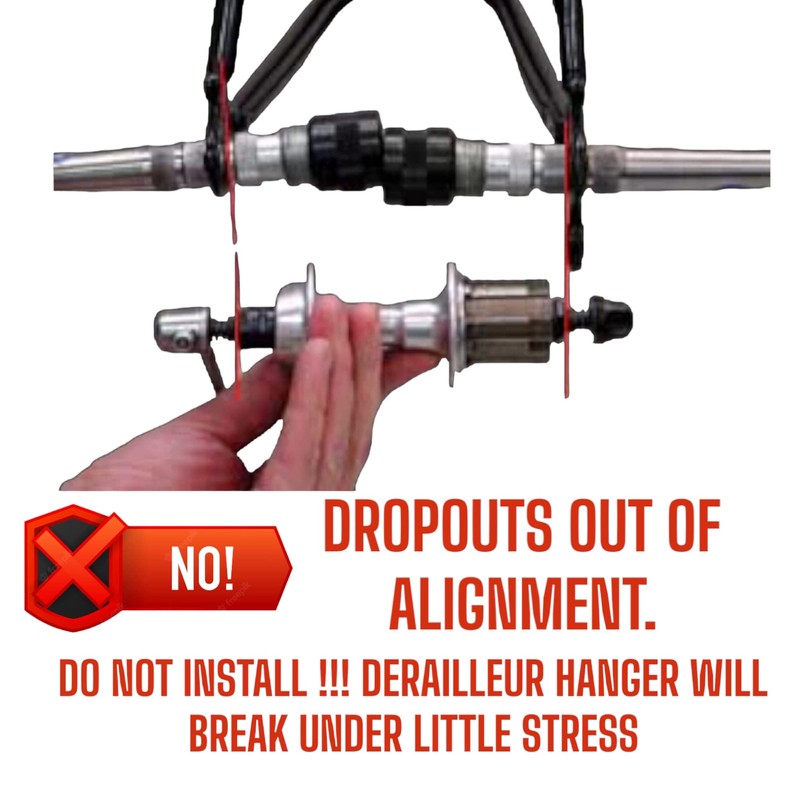 - INSTALLATION: Recommended to check rear dropout alignment before installation. If not Aligned. Derailleur Hangers will continue to break until Dropouts are aligned