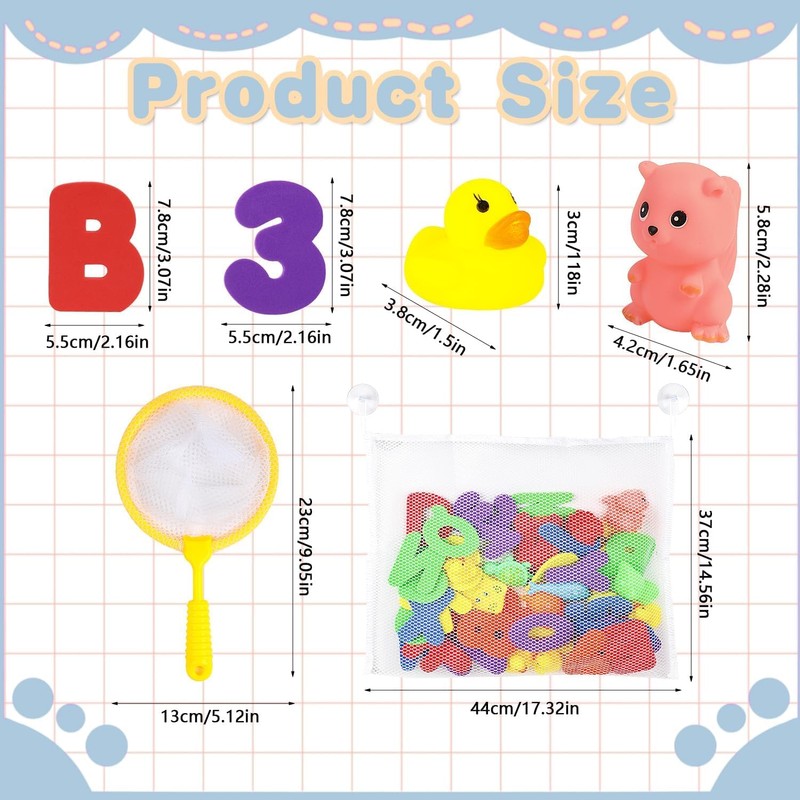 • Set — You will receive 1 x bath toy bag, 1 x fishing net and 12 x squeaky and floating bath toys, 36 foam letters and numbers. It easily attracts baby's attention.
