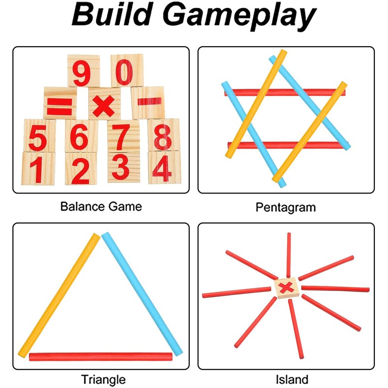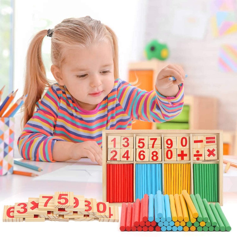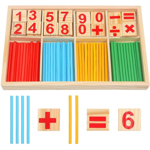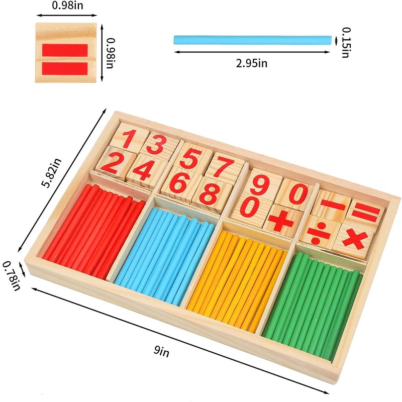 • 1. Montessori maths toy contains the numbers 0-9, mathematical symbols and small wooden sticks in the four colours red, yellow, blue and green.