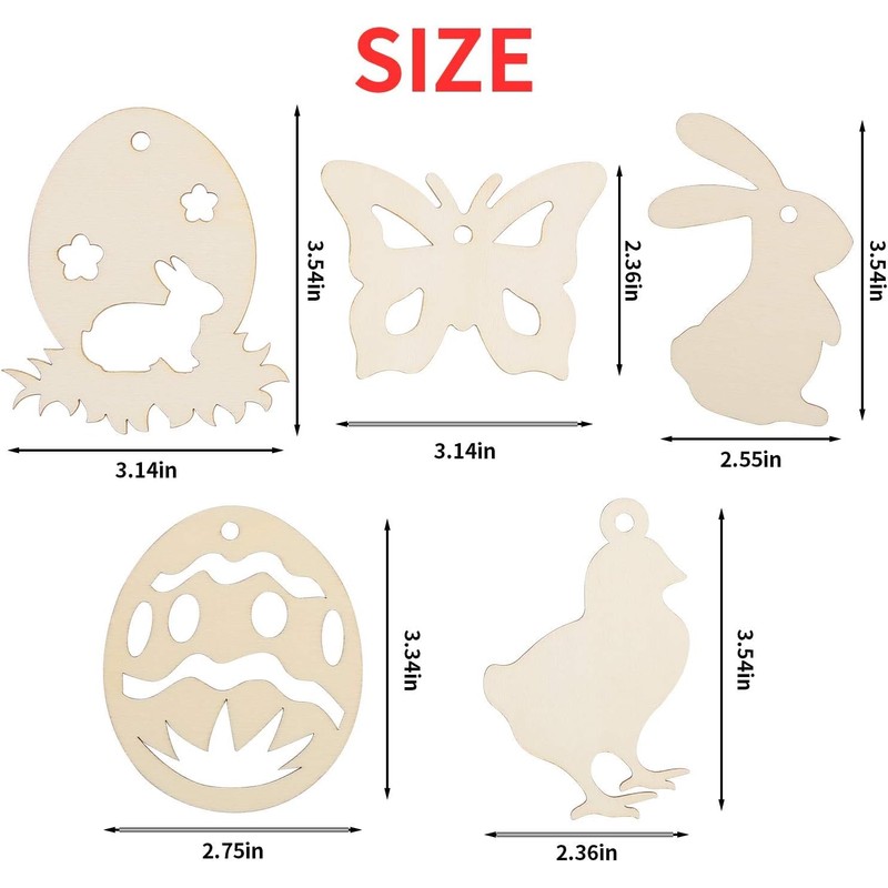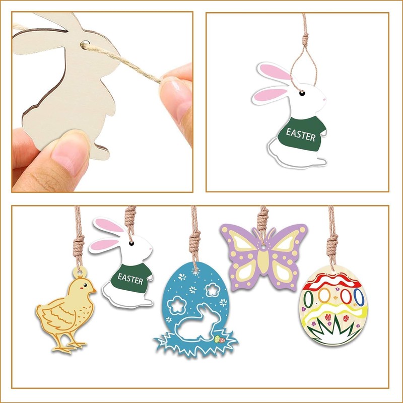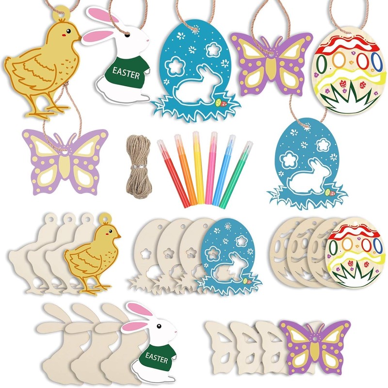 DERAYEE Pack of 20 Easter Crafts Wood, Wooden Pendants Easter Eggs for Painting, DIY Easter Pendants, Wood, Easter Bunny, Easter Eggs, Chicks, with String, Pens, Easter Decoration Crafts Children