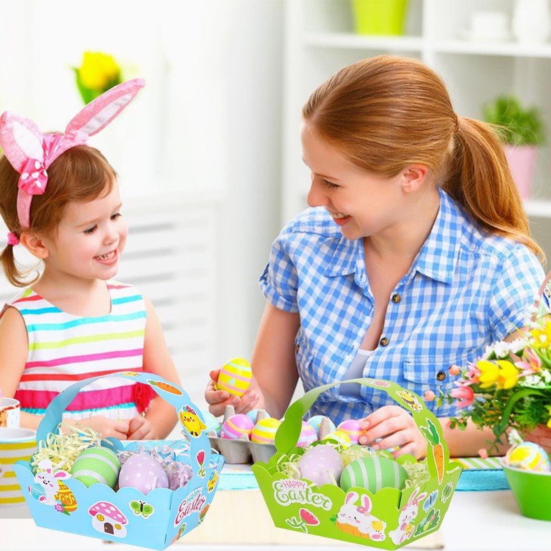 - Material: The cute Easter baskets are made of premium cardboard, no unpleasant smell, reusable and durable, clear and bright printing, not easy to fade. Sturdy handle is very convenient for you to hold things and carry around when going out.
