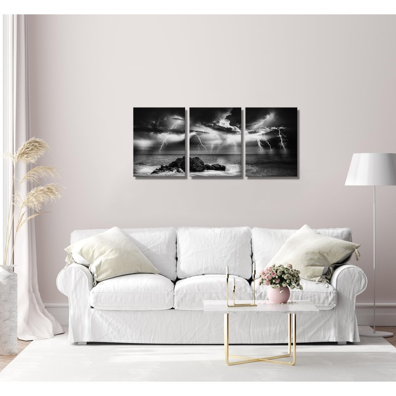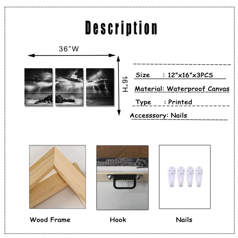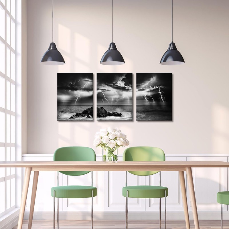 Derkymo 3 Pieces Nature Lightning Strikes in The Clouds Painting on Canvas Black and White Landscape Wall Art Ocean Coastal Night View Picture Print for Home Office Decoration Wall Decor 12"x16"x3pcs