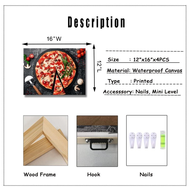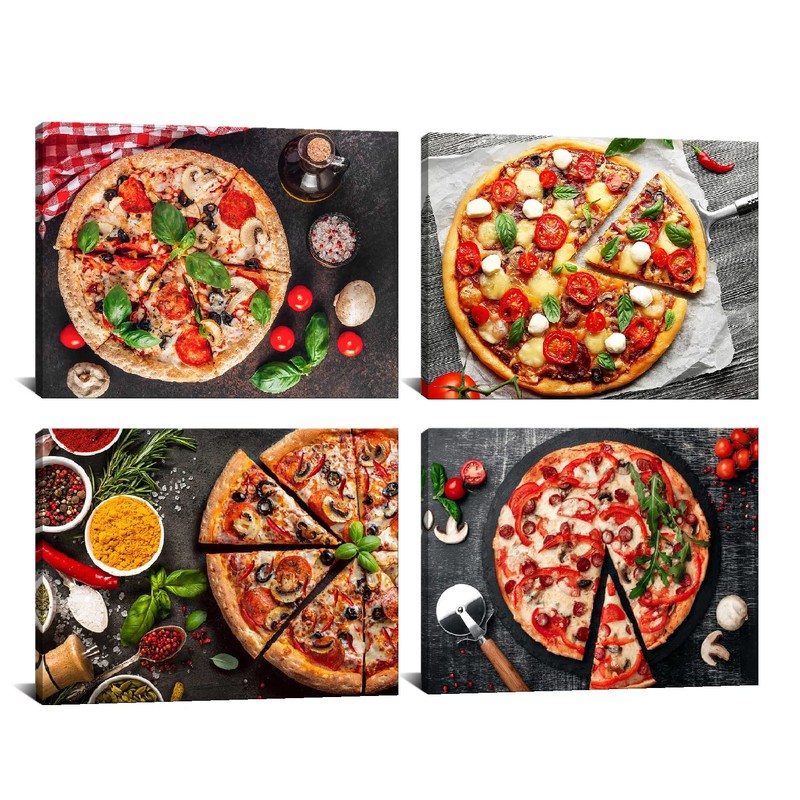 Derkymo 4 Pieces Food Canvas Wall Art Delicious Italian Pizza Served on Wooden Table Food Pictures Stretched Gallery Canvas Wraps Giclee Print for Kitchen Dinning Room Restaurant