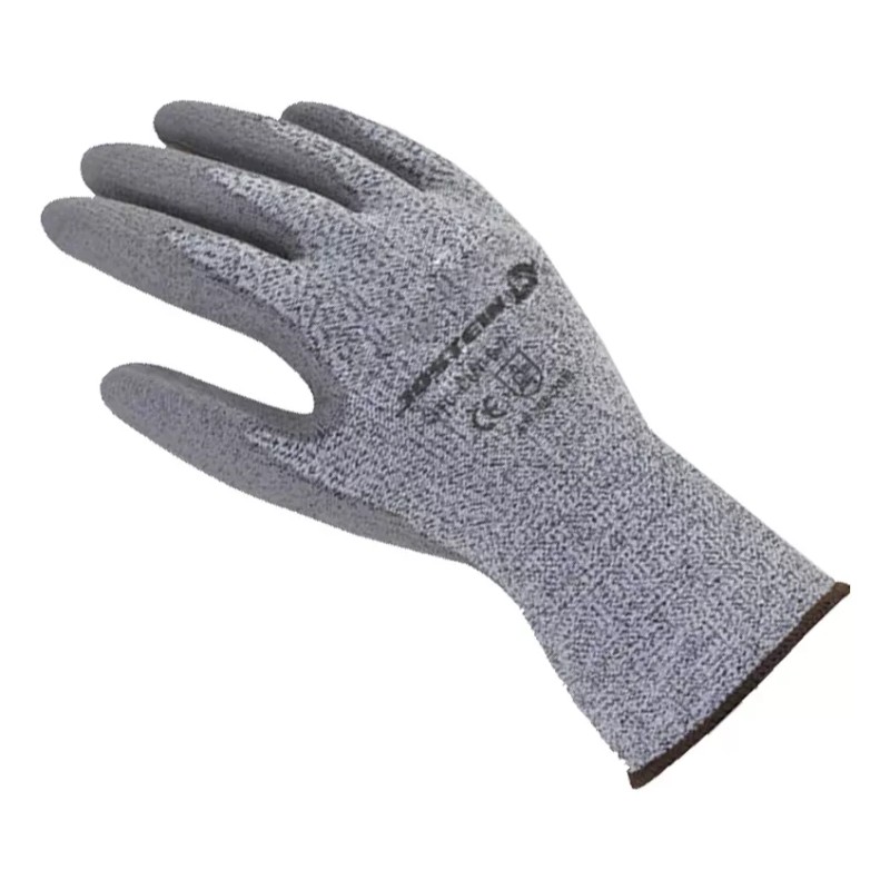 Guante anti corte de polietileno de alta densidad, fibra de vidrio e hilo de acero con poliuretano gris en palma y puño tejido de punto ribeteado con certificado ANS.