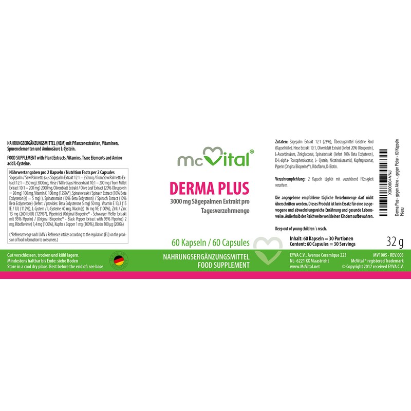 The best quality raw materials and is of the highest organic availability are not for the faint of heart. Thanks to the long term conjunction our experts has resulted in an extremely complex and formula. In addition to the Sägepalm, millet, spinach and olive leaf extract is our innovative skin formula with added vitamin C, B2, B3, biotin, copper and zinc, to be able to significantly better results. Our Derma Skin Capsules are the quickest way to Bioverfügbar, so that the top of the food ingredients provide high over the digestive and just get to the blood vessels. We recommend you two capsules on a daily basis.
