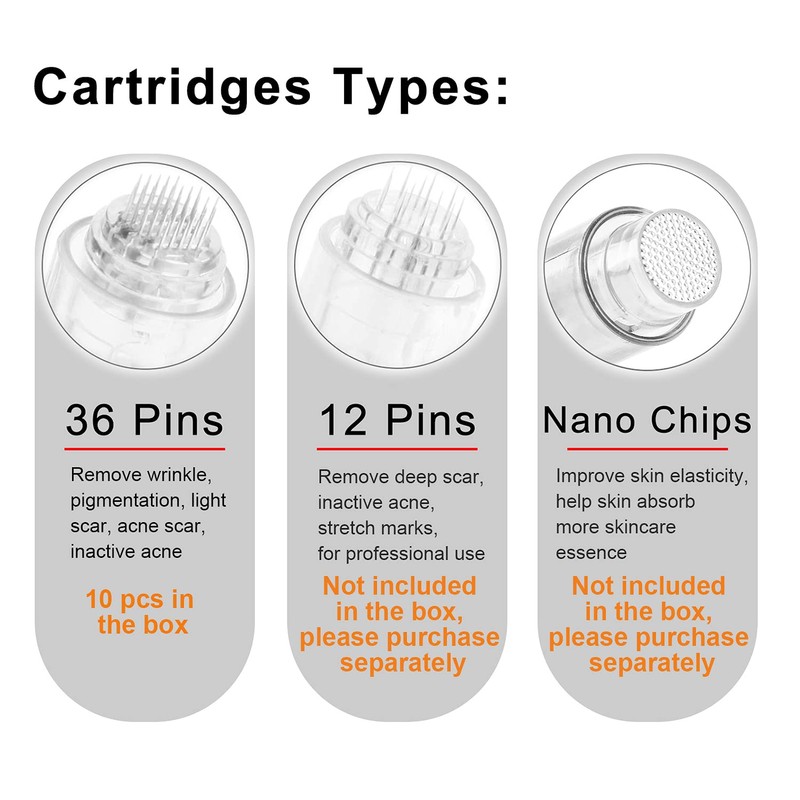 - Derma pen with cartridges can improve rejuvenation results, maintain epidermal integrity and improve damaged skin. The needle is combined with an automatic stamp-like pen. Nano tips are sepcial for the absorption of topical nutrition.