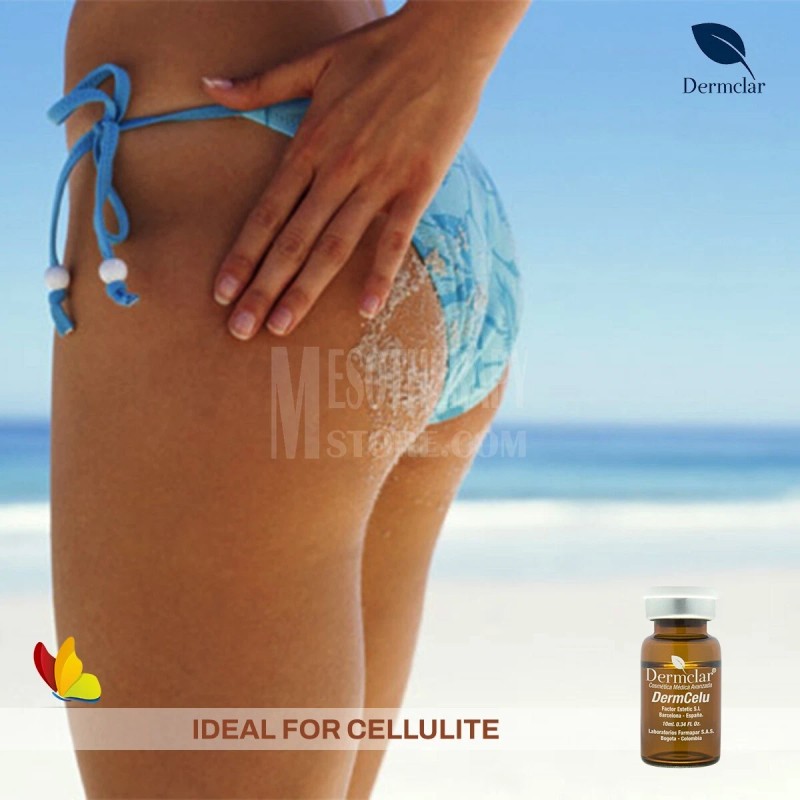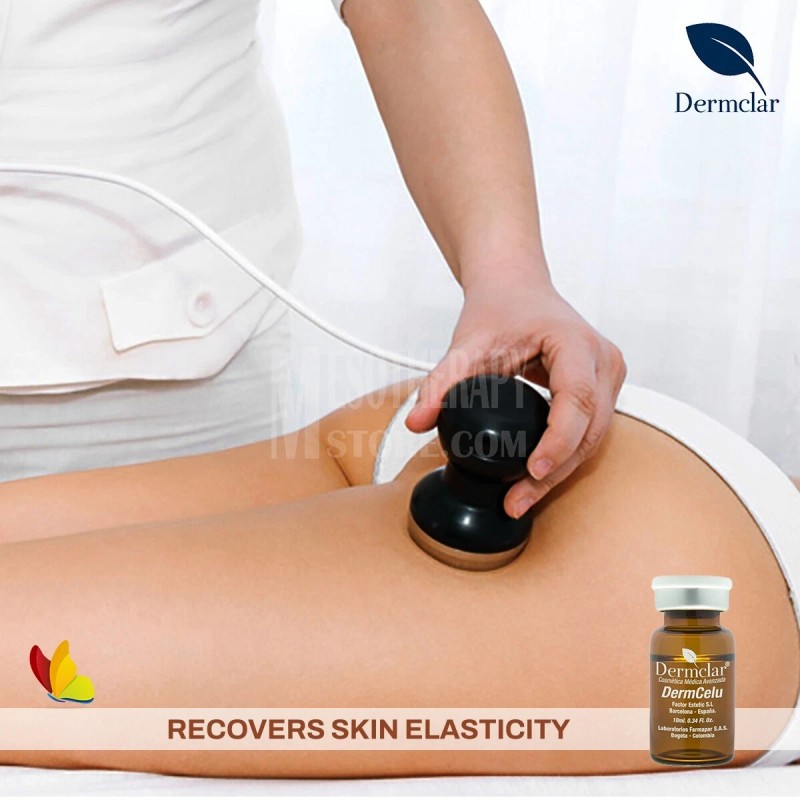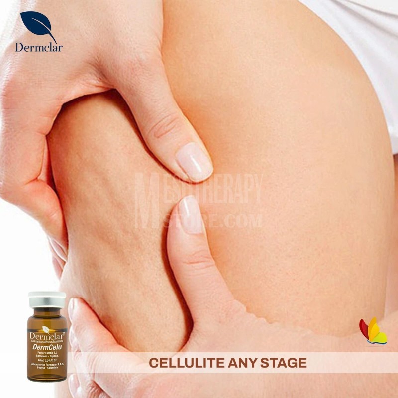DERMCELU de Dermclar es una solución estéril de uso profesional formulada para tratamientos estéticos de mesoterapia corporal. Su combinación de ingredientes como cafeína, centella asiática, L-carnitina y silicio orgánico actúa para mejorar visiblemente la textura de la piel, atenuar la apariencia de celulitis y apoyar la tonificación corporal.