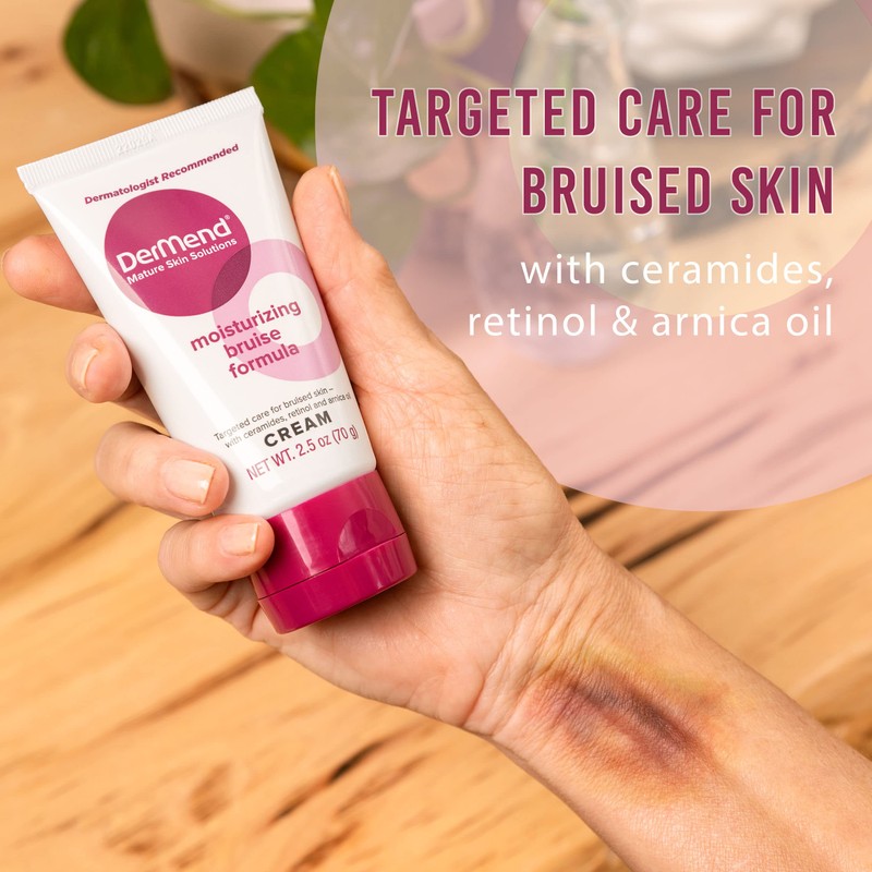 As we age, it seems like even the most minor bumps cause pain and bruising on our skin. That's because our skin begins to thin as we get older when the protective fatty layer underneath begins to deplete. This means your skin no longer has the cushion it needs to protect itself, causing capillaries under the skin to break easier and create bruises that take longer to heal. But with the specially designed formula of DerMend's moisturizing bruise cream, you can restore your skin's natural barrier and fight back against the effects of aging on your skin.MOISTURIZES & PROTECTSToo many products on the market act as just a bruise concealer. But that's not the case with DerMend's moisturizing bruise formula. Our cream not only works to reduce the appearance of bruising, but it also helps to restore, rejuvenate and repair the skin's natural barrier. With our cream, you can repair and nourish your skin, while helping to protect against further damage.NATURAL REMEDYThe DerMend moisturizing bruise cream is packed full of natural ingredients and vitamins the skin needs to look its best. Among the main ingredients are retinol, arnica oil from the arnica montana flower, ceramides and Vitamin K.SOOTHING CREAMSThere's nothing worse than a cream that makes your hands slick and causes you to leave greasy fingerprints on everything you touch. That's why the DerMend moisturizing bruise cream is specially formulated to be light and non-greasy. Our cream spreads easily on your skin, penetrating deep into the affected area to offer maximum relief.DERMATOLOGIST RECOMMENDEDOur moisturizing bruise formula lotion is dermatologist recommended and has been used by many who want to improve the health of their skin. At DerMend, we are focused on providing mature skin solutions and helping our customers look and feel better. For best results, apply our skin cream to the affected area twice a day.