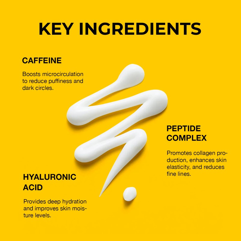 • Peptide & Caffeine Complex: Infused with advanced peptides and caffeine to support skin firmness and visibly reduce under-eye fatigue, puffiness, and discoloration.