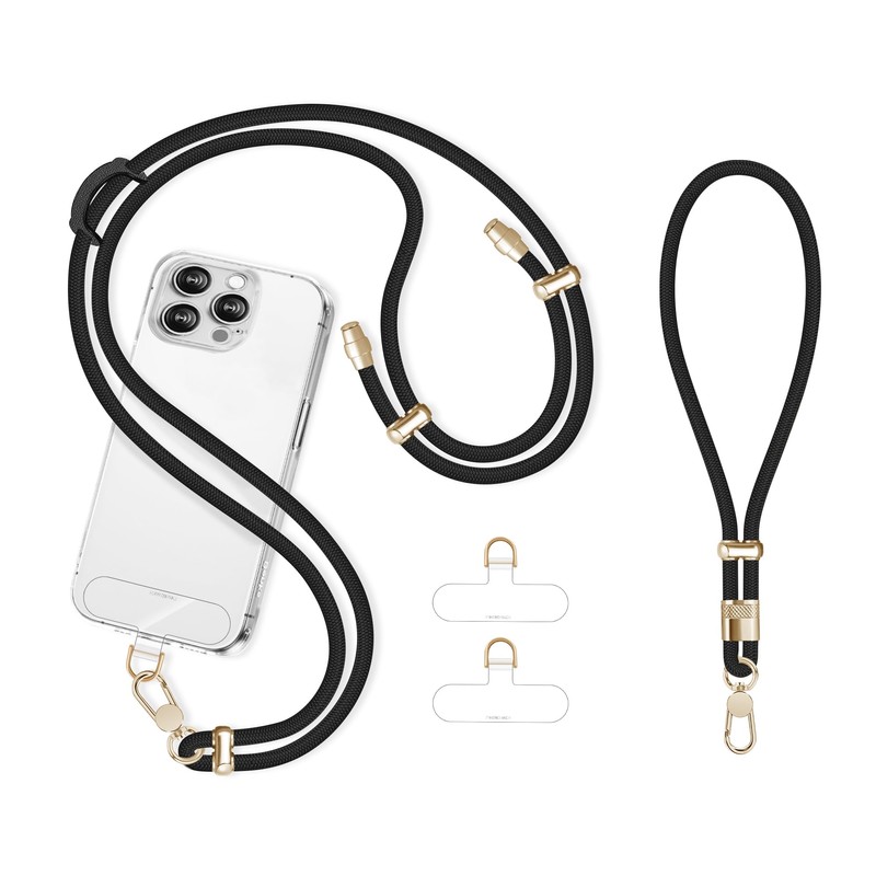 Derraffina Cell Phone Lanyard Adjustable Crossbody Phone Lanyard *1 Phone Wrist Strap *1 with Deluxe Gold Matal Buckle + Clear Tether Tabs *2 for Shopping Travelling Hiking(BLACK)