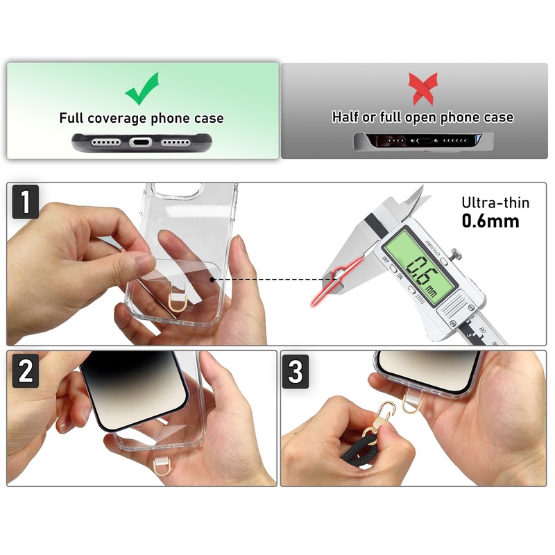 - Easy to install and does not affect charging: Pass the clear Phone lanyard tab through the charging hole of the phone case, attach the smartphone and the metal buckle with the phone lanyard to complete. The phone lanyard tab is only 0.6mm thin and does not affect the charging port or wireless charging or case fitting. There is no adhesive on the phone strap holder, and it can be used freely without leaving any marks inside any iphone case.