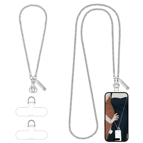 Derraffina Metal Phone Chain,Hands-Free Cell Phone Chain Crossbody Detachable Phone Strap Fits for Smartphone,1* Phone Lanyard,1*Phone Wristlet Strap,2*Cell Phone Tether Tabs (Silver,Long)