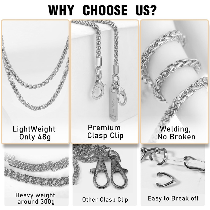 - [Premium phone Chain] Our colorfast, skin-friendly cell phone chain is made of high-quality metal, and by adopting monolithic molding technology, the anti theft phone strap is sturdy and has more advanced functions. The length of the long and short chains are 49.8 inches (unfolded) and 25.5 (folded), and 10.5 inches(unfolded),5 inches (folded) The Weight are of the long and short chains are 1.72 ounces and 0.49 ounces respectively.