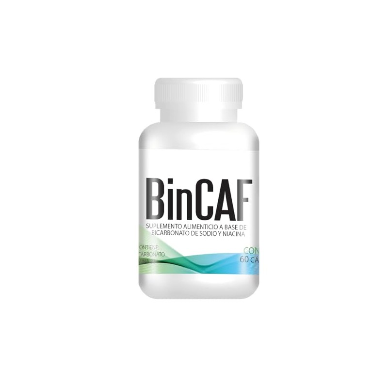 Nombre del Producto: Bincaf 500. Descripción: Suplemento alimenticio a base de Bicarbonato de Sodio y Niacinamida. Ingredientes: Cada cápsula contiene .5g de bicarbonato de sodio y 2.5mg de Niacina (ácido nicotínico y niacinamida). Presentación: Bote con 60 cápsulas.