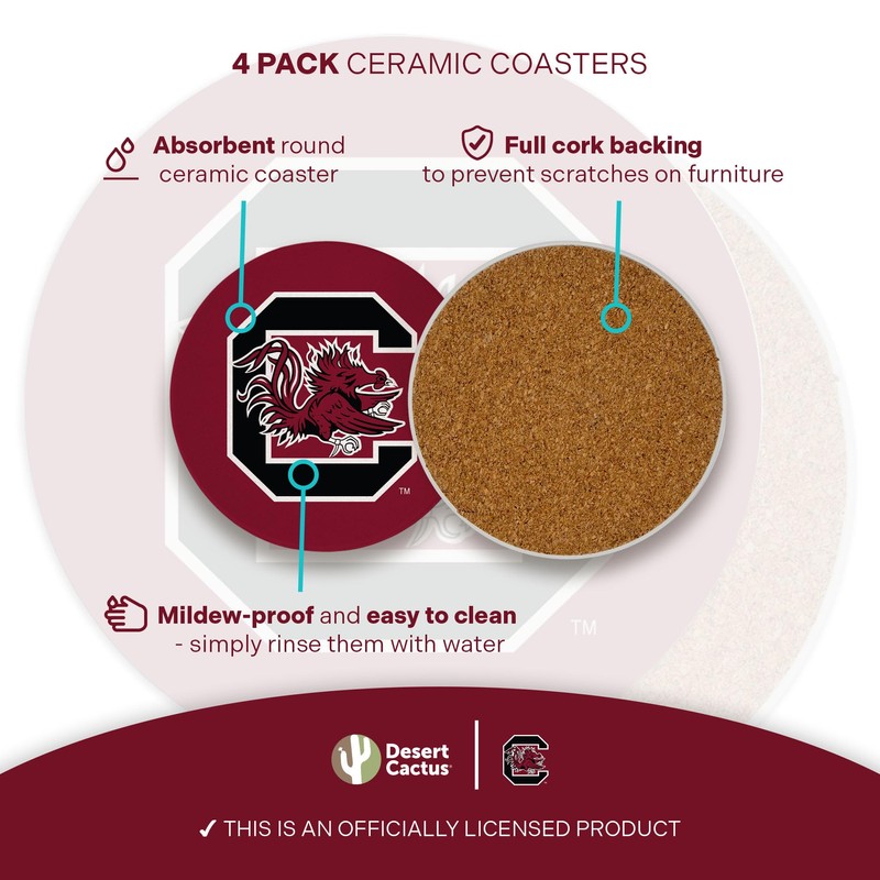 Desert Cactus University of South Carolina Ceramic Coasters 4 Pack Gamecocks USC Absorbent Drink Coasters with Cork Backing (Design A)