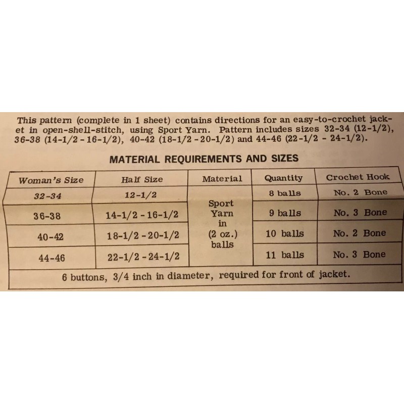 This pattern contains directions for an easy to crochet jacket in an open shell stitch, using sport yarn. Crochet hook used number two bone or number three bone.  This pattern includes women’s size 32 to 34, 36 to 38, 40 to 42 and 44 to 46; this pattern also includes half sizes 12 1/2, 14 1/2 to 16 1/2, 18 1/2 to 20, and 22 1/2 to 24 1/2.