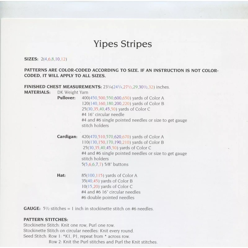 Design by Louise Knitting Pattern #25 Yipes Stripes Children 2-12 Sweaters Hat