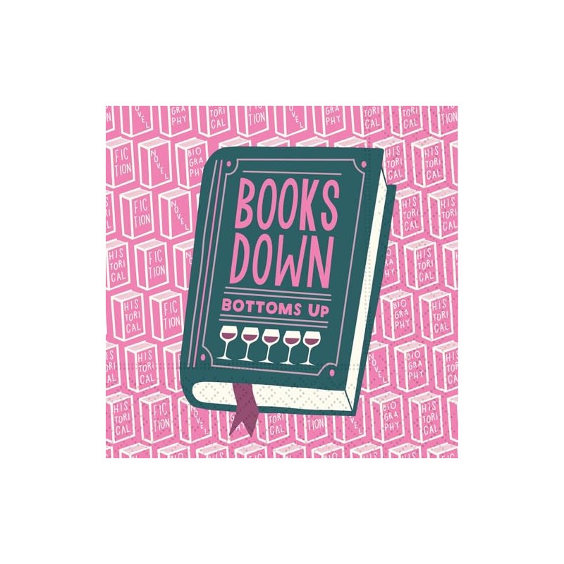- Fun "Books Down Bottoms Up" design blends literature and drinks.