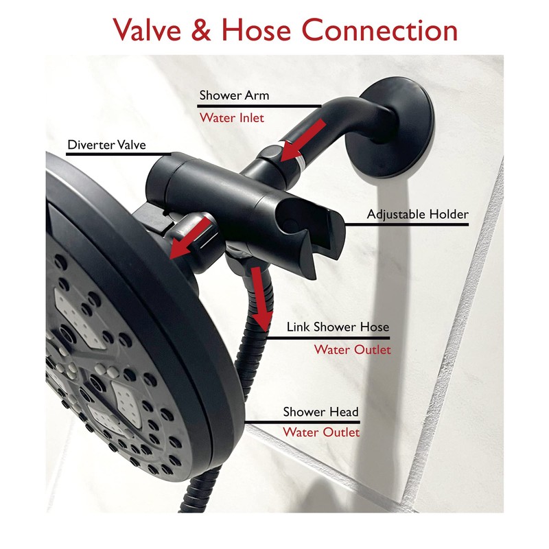 • 3-Way Diverter Function: Conveniently switch between hand shower only, fixed showerhead only, or both hand shower and fixed showerhead simultaneously