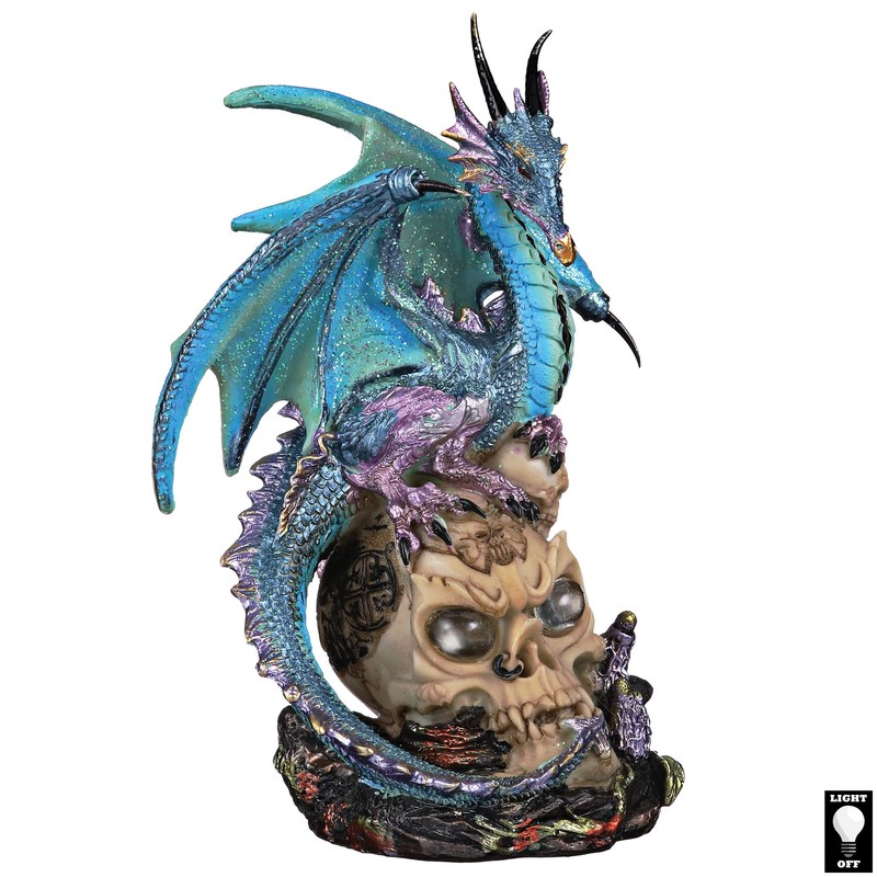 - DRAGON ASSASSIN STATUE boasts light pulsing from eerie eye sockets and a macabre, Celtic skull to light your night!
