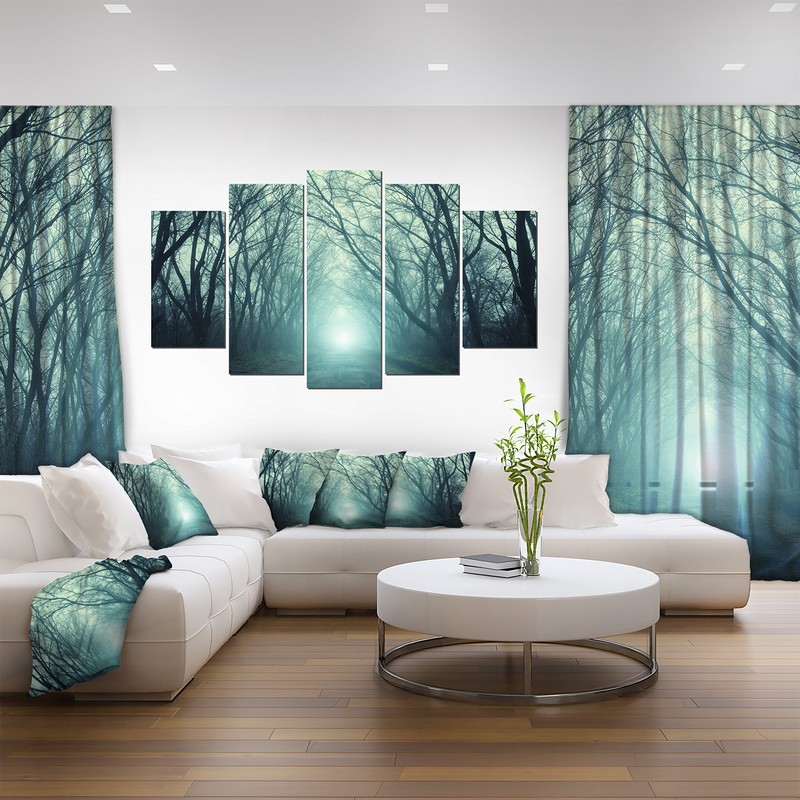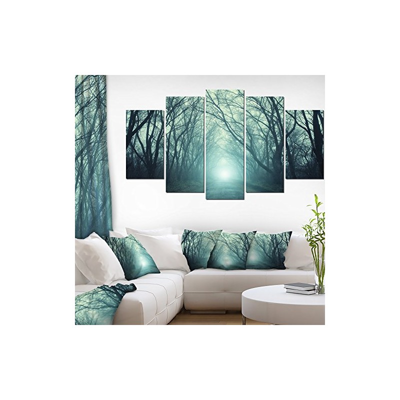 Designart Fall Forest Path with Green Light-Landscape Photo Canvas Print-60x32 5 Piece, 60x32-5 Panels Diamond Shape, Blue
