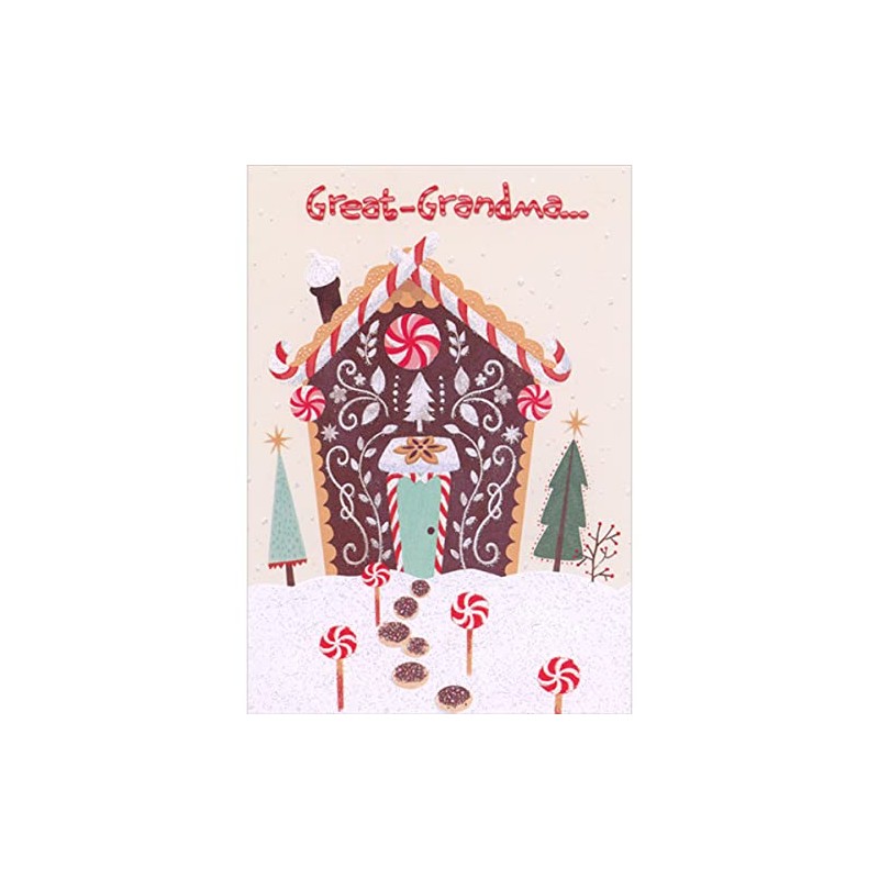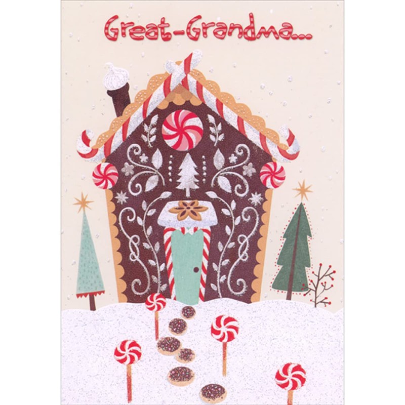 Designer Greetings Sparkling Brown Candy House and Cookie Path Juvenile Christmas Card for Great-Grandma