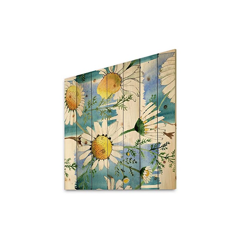 DesignQ Wild Spring Chamomile Flowers Traditional Wood Wall Decor, Blue Wood Wall Art, Large Floral Wood Wall Panels Printed On Natural Pine Wood Art