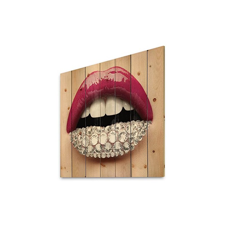 DesignQ Woman Lips With Pink Lipstick White Diamonds Modern & Contemporary Wood Wall Decor, Pink Wood Wall Art, Large People Wood Wall Panels Printed On Natural Pine Wood Art