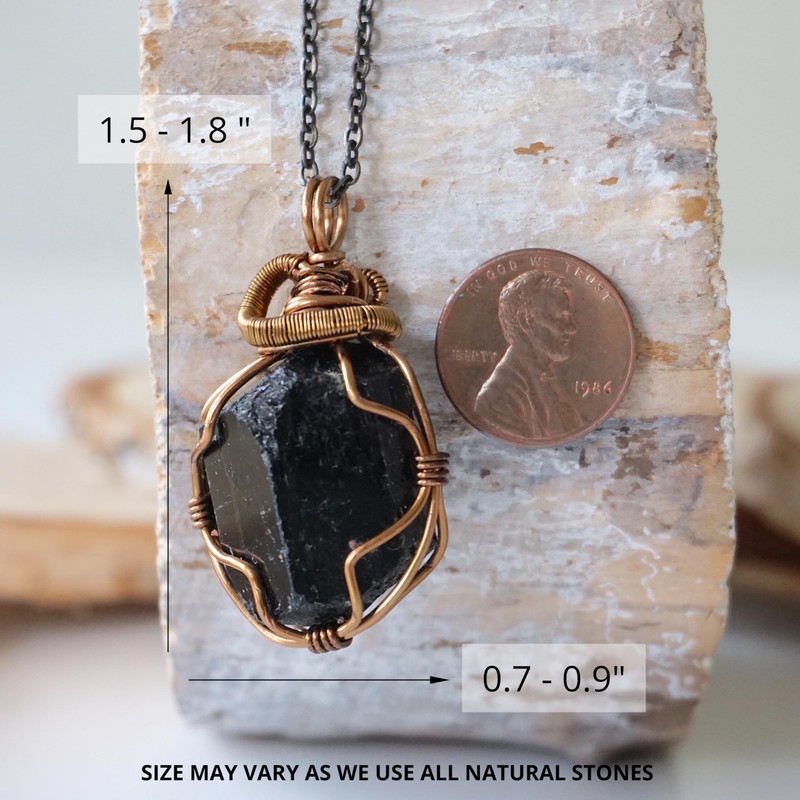 - NECKLACE SIZE & METAL - Your raw black tourmaline pendant is about 1.5-1.8" (H) x 0.7-0.9" (W). Size may vary as we use all natural stones. It comes with a 24 inch antique bronze chain. All necklaces use high quality antique bronze copper core wire.