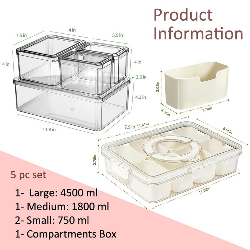 Desire Fridge Organizer with Divided Serving Tray - 5PCS BPA-Free, Clear Stackable Fridge, Pantry, and Freezer Organizer with Handles for Snacks, Fruits, Veggies, Meal Prep, Travel, Picnic