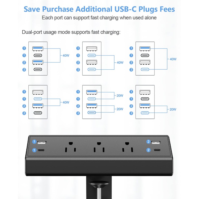 - Desk Mount USB Charging Power Station:2 PD 20W USB- C (each USB C port features PD 20W Max) & 2 QC3.0 USB- A Port(each USB A port features 3A Max). (Note: 40W is the total output of both USB-C ports, and each port's max output is PD 20W).