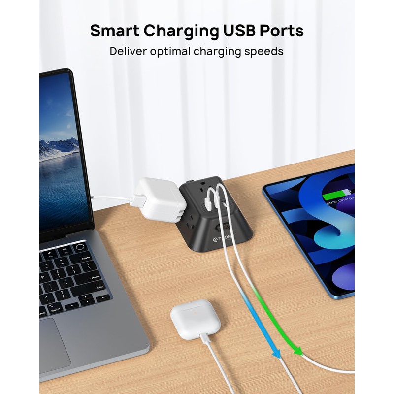 - Desk Power Strip with USB: Equipped with 1 USB- C(5V/5.3A) & 2 USB- A Port(5V/2.4A). empowering you to charge up to 8 devices simultaneously without needing multiple adapters. Keep your desk tidy and organized while efficiently powering your cellphones, laptops, tablets, and cameras.