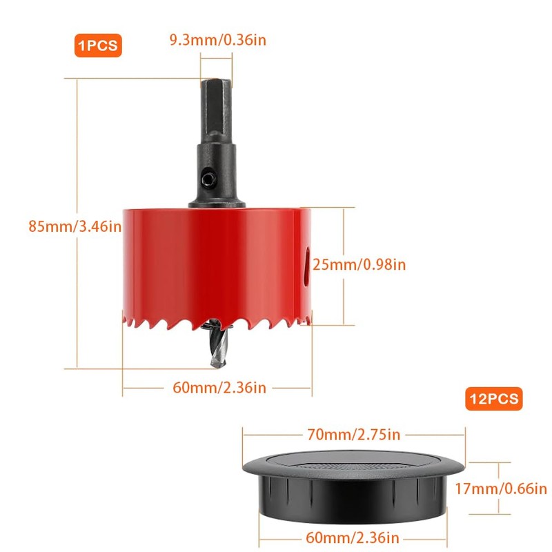 - 🔌Package contains: You will receive 12 pieces 60mm cable grommet, 1 piece 60mm high speed steel hole saw with hex shaft and spring. The hole saw fits into a standard drill bit
