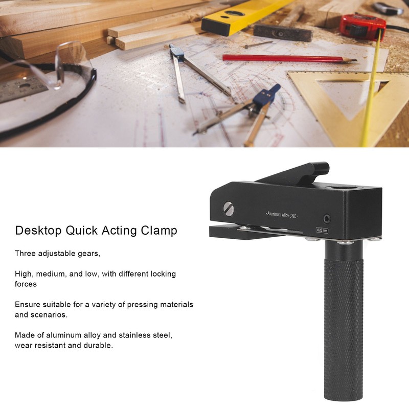 1、STANDARD SIZE: The manual quick acting clamp has a compact structure and a standard diameter, which is convenient to stably fix on the desktop. 2、3 GEARS ADJUSTABLE: Providing high, medium, and low gears with different mold locking forces, ensuring that the clamp is suitable for a variety of materials and use scenarios. 3、ALUMINUM ALLOY, STAINLESS STEEL MATERIAL: Made of premium aluminum alloy and stainless steel material, this woodworking hold down clamp is strong and sturdy, wear resistant and durable, ensures a long life span. 4、GLOSSY SURFACE: This hold down clamp has a glossy appearance, no nicks and no burrs, and will not hurt hands or damage other objects during operation. 5、EASY CARRYING: This clip is small and compact in size, and light in weight, easy for you to carry around for convenient use.
