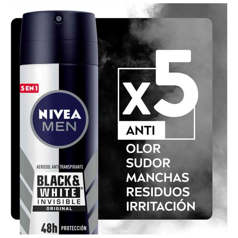 El desodorante en spray Nivea Men black & white invisible original es un antitranspirante con 48 horas de protección contra la humedad de las axilas y el olor corporal.