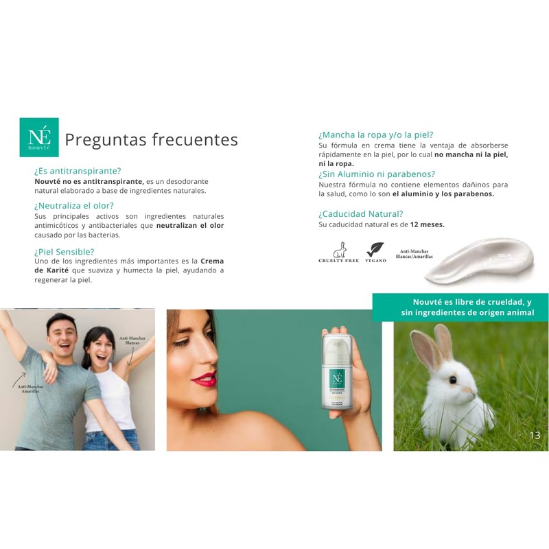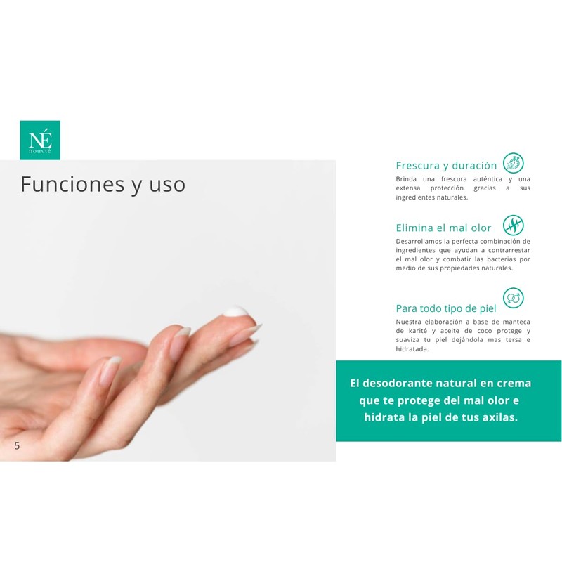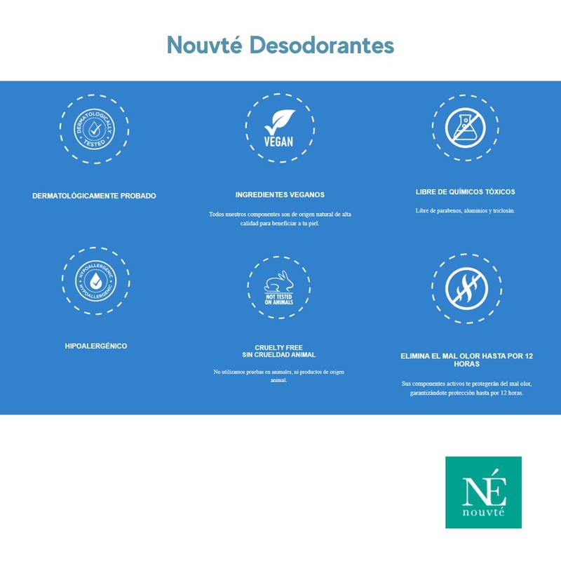 Nouvté Natural: Your Ally in Underarm Care and Skin Health In a world where awareness about the ingredients we apply to our skin and their impact on our health is constantly growing, Nouvté Natural stands out as a pioneering and dedicated option for the well-being of your underarms and your entire body. Our Mexican company takes pride in introducing Nouvté, a truly innovative and healthy cream deodorant designed to provide you with a unique and safe care experience. The Essence of Nouvté: Natural Ingredients of the Highest Quality The philosophy of Nouvté is based on the premise that nature provides the best ingredients for caring for our skin. That's why we have carefully selected top-quality natural ingredients to create a formula that not only protects your underarms but also enhances the overall health of your skin. With Nouvté, you can be confident that each application is an act of love for your body. Discover Nouvté Natural and Elevate Your Personal Care to a Higher Level Nouvté Natural is much more than a deodorant; it's a commitment to the health and well-being of your skin. Discover for yourself why Nouvté is the perfect choice for those seeking healthy underarm protection and radiant skin. Experience unparalleled freshness and care with Nouvté. Your skin will thank you.