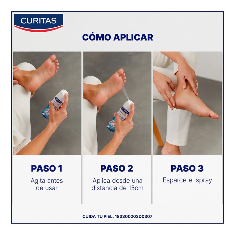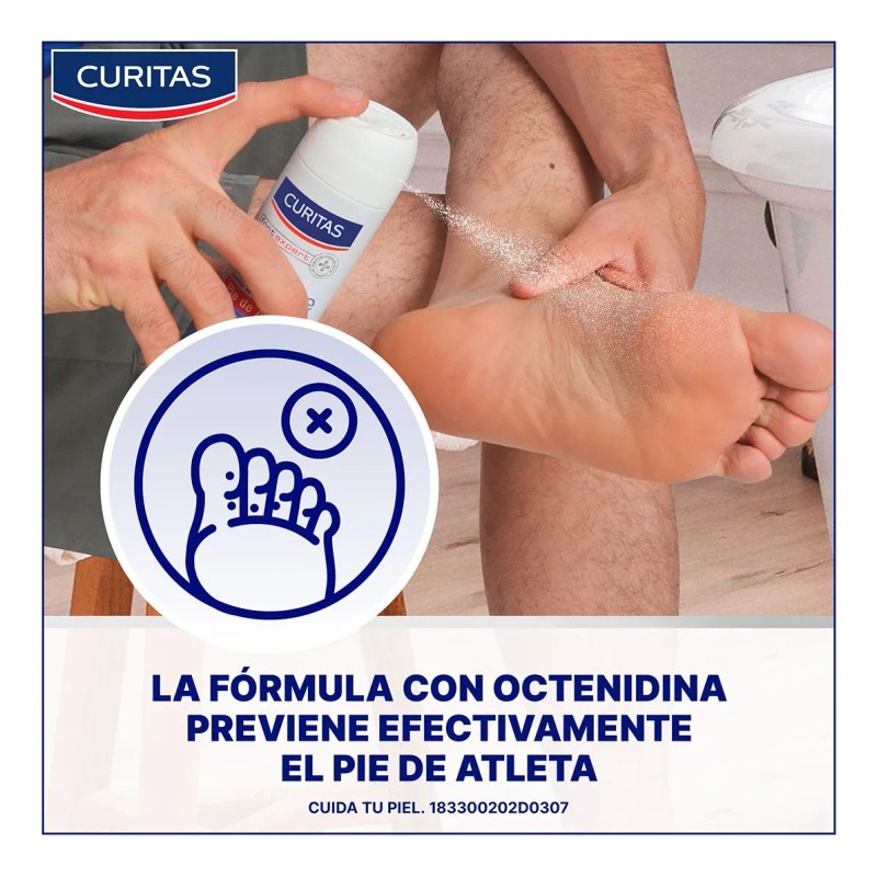 El desodorante para pies Curitas ayuda a prevenir la formación de bacterias y hongos en los pies, evitando el padecimiento de pie de atleta mientras ofrece protección contra el mal olor hasta por 48 horas, apto para diabéticos.