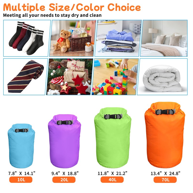 - 【Multiple Color/Size Choice】You can choose from orange, green, blue and purple. Any of the bright colors bringing you a bright mood and making your outing or storage room a beautiful scenery. We have waterproof dry sacks from small to large, ranging from 10L, 20L, 40L to 70L, meeting all your needs to stay dry and clean.