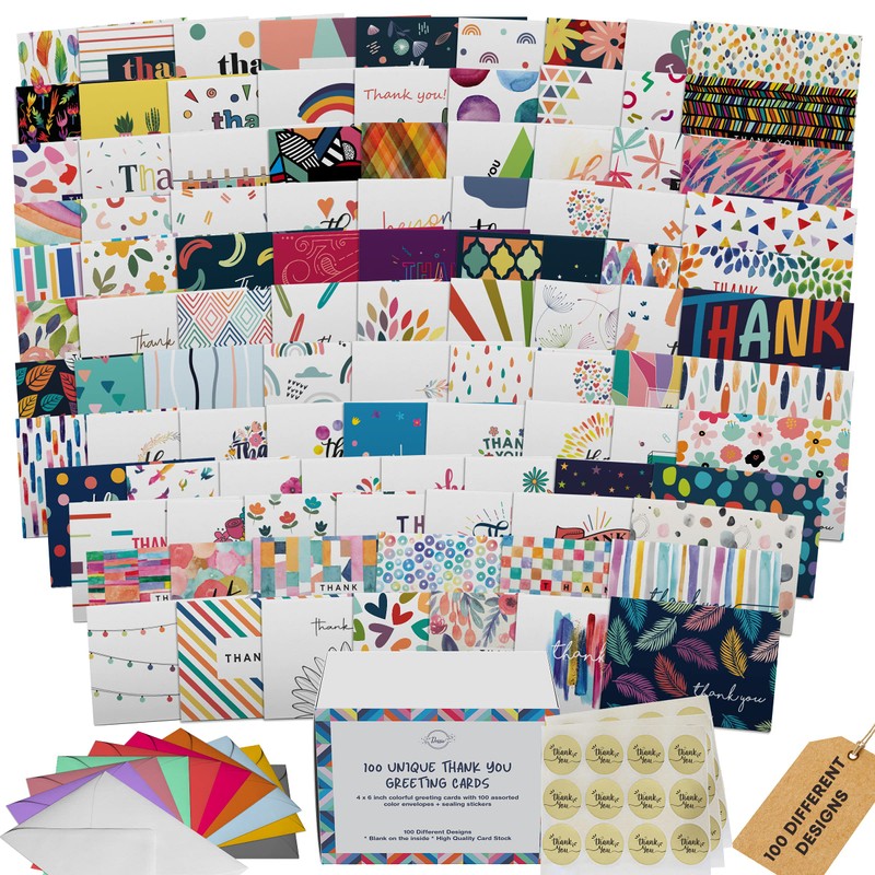 - THE PERFECT KIT FOR CRAFTING PERSONALIZED THANK YOU CARDS: 100 different high quality cards with beautiful, vibrant designs; 100 assorted color superior quality envelopes; 100 “thank you” gold sealing stickers – you don’t need anything else to craft the perfect thank you note card!