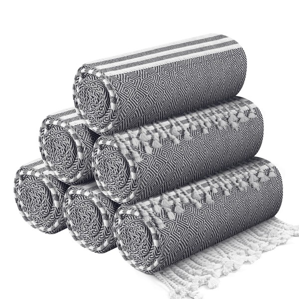 DESTIN HOME Set of 6 Turkish Peshtemal Beach Towels Cotton 36x71 Inch - Soft, Lightweight, Quick-Drying, and Absorbent for Beach Pool Spa Picnic Travel or Bath Use - Sand-Free Turkish Towels Black