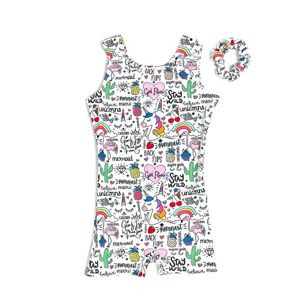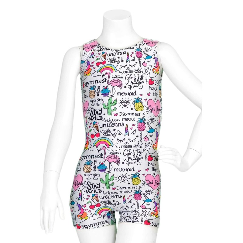 Destira Girl's Unicorn Doodles Gymnastics Unitard| White | Child Large (10-12) | Fabric/Lycra
