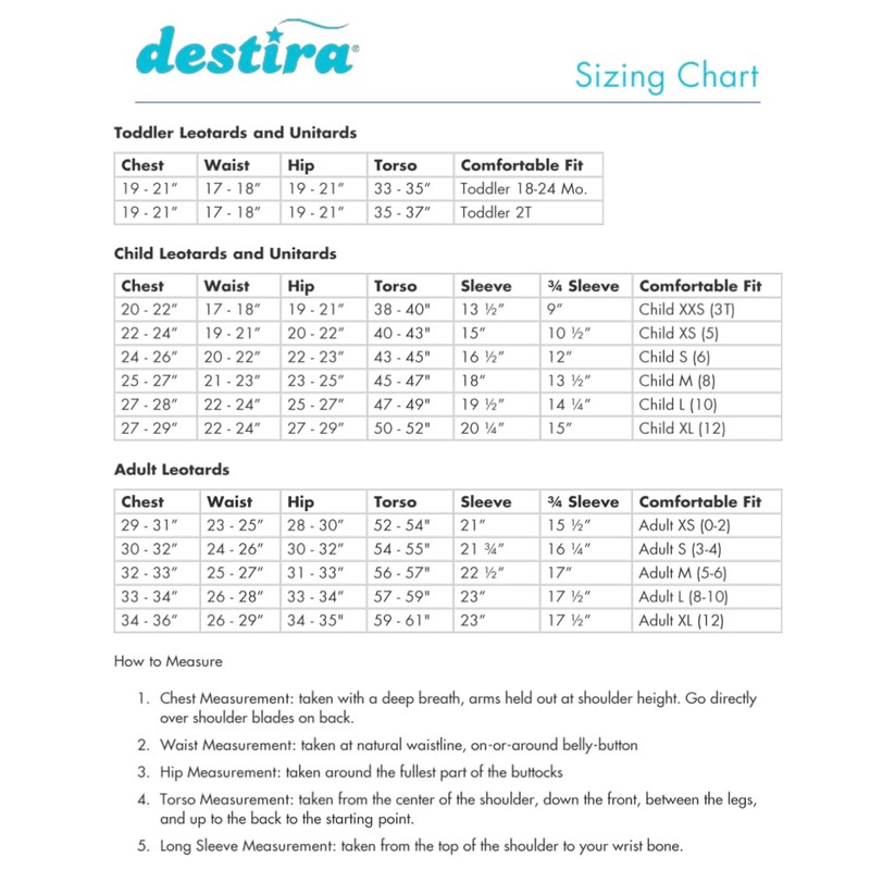 - SIZING INFORMATION - Refer to our Sizing Chart to choose the best fit dance and gymnastics leotard for girls. Do NOT refer to sizes from other brands. Dance and Gymnastics apparel is made to fit tightly; to accommodate growth and motion in dancing or athletics, buy one size up.
