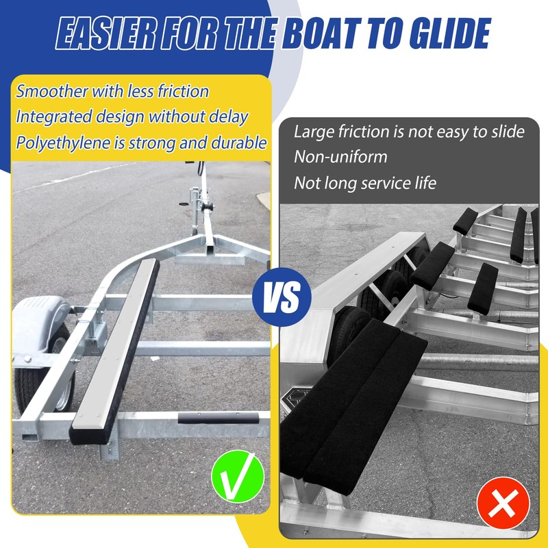 • A SMOOTH SURFACE WITH REDUCED FRICTION: If you have trouble pushing the boat off the trailer, trailer bunk glides is a great option for the sliding pads on the trailer. It have a smooth surface with reduced friction, making it easier to slide the boat on and off the trailer without damaging the body.