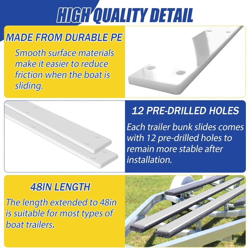 This is 48 x 3in Smoother Solid High Density Polyethene trailer bunk glides, ease of installation and loading boat trailer bunk slides, trailer bunk pads with stainless screws and 12 mounting holes, boat trailer bunks for fiberglass or aluminum Boat, Jet Ski or pontoon boat
