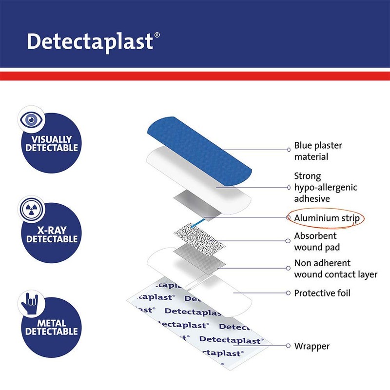 - Metal detectable indispensable in any kitchen. Thanks to the blue colour and the aluminium strip under the wound dressing, these plasters can be quickly identified visually and are easy to find using standard metal detectors.