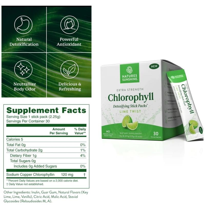 Chlorophyll Stick Packs (Lime Twist): Refreshing, easy-to-use stick packs that support natural detoxification, digestion, energy, and skin health.