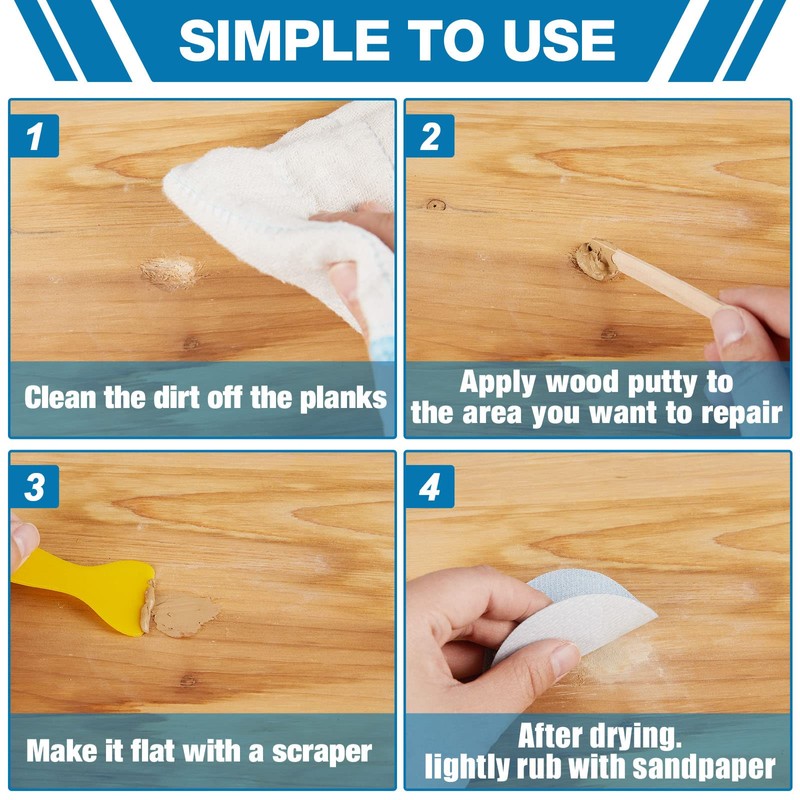 - ⚒️ Wide Application: This wood putty filler is ideal for wood furniture repair, suitable for wooden veneers, desks, wooden floors, cabinets, tables, doors, etc. Say Goodbye to Unsightly Cracks and Holes.