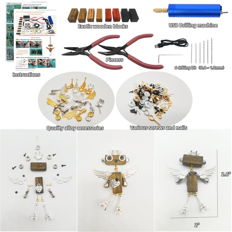 - COMPLETE KIT & EASY TO MAKE WITHOUT A MESS: This kit comes with everything you need to make 4 robots necklace. Various alloy accessories, exotic wooden blocks, drilling machine tools , easy to follow tutorials and all crafting supplies necessary to finish your own pendants gift