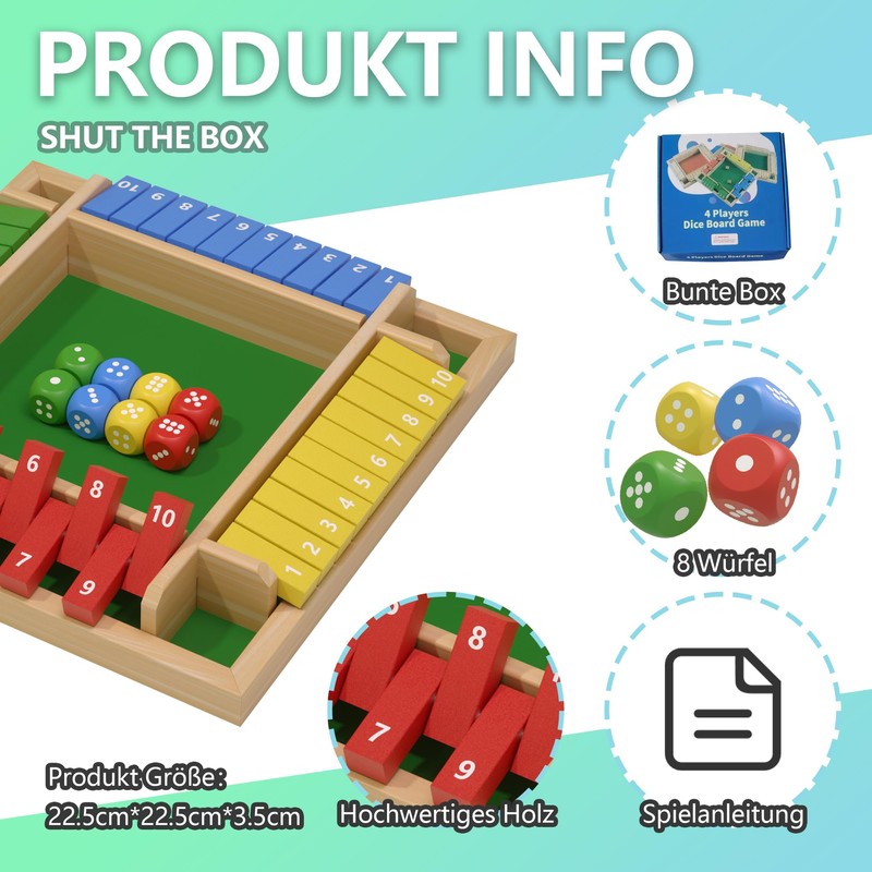 - 👍【DEUXYU Shut the Box Game】: The Shut the Box game is lightweight and compact, only 22 x 22 x 3.5 cm, ideal for beach, camping, travel, picnic, parties, take it with you, enjoy a nice time together with friends and family. In addition, our Shut the Box game with German instructions, but if you have any question with the Shut the Box game or playing method, please contact us at any time, we strive to provide you with the best service!